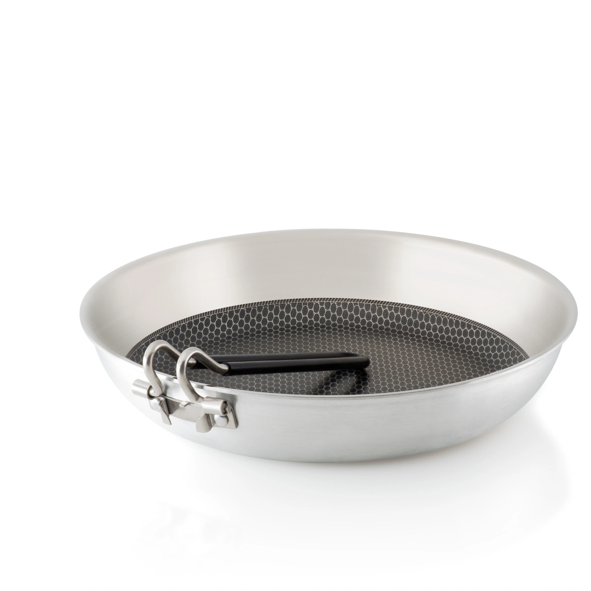 The Glacier Stainless 10 inch Frypan from GSI is made of Glacier Stainless™ premium 18/8 stainless steel. With a brilliant, rust-proof finish and the strength that only steel can provide, Glacier Stainless is the material of choice for decades of use. And with a heavy-gauge, clad aluminum core, these frypans remain lightweight and quick heating over any heat source, just like the finest gourmet pans. And the laser-etched nonstick surface offers excellent food release and easy cleanup. Of course, our premium 304 (18/8) stainless steel construction is still non-reactive, free of BPA, PFOA and Phthalates- what could be better than that?
