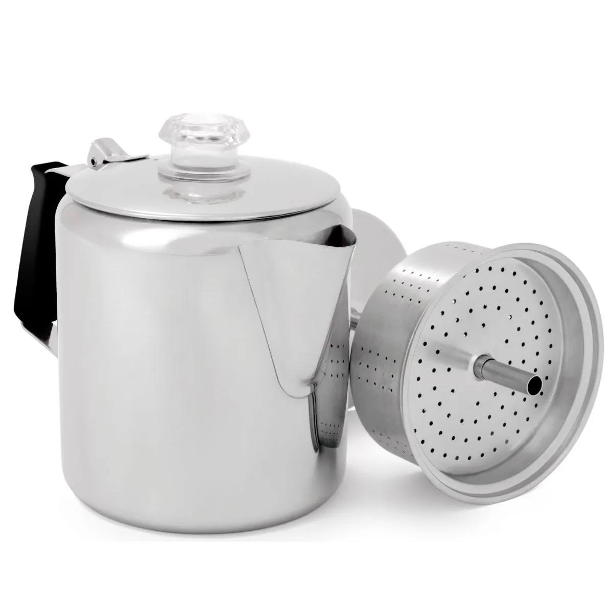 The Glacier Stainless 6 Cup Perc with Silicone Handle from GSI is a classic stove top percolator that features an ultra-rugged construction and a handy PercView knob that lets you gauge the strength of your brew. The heat-resistant silicone handle provides safe and secure pouring.