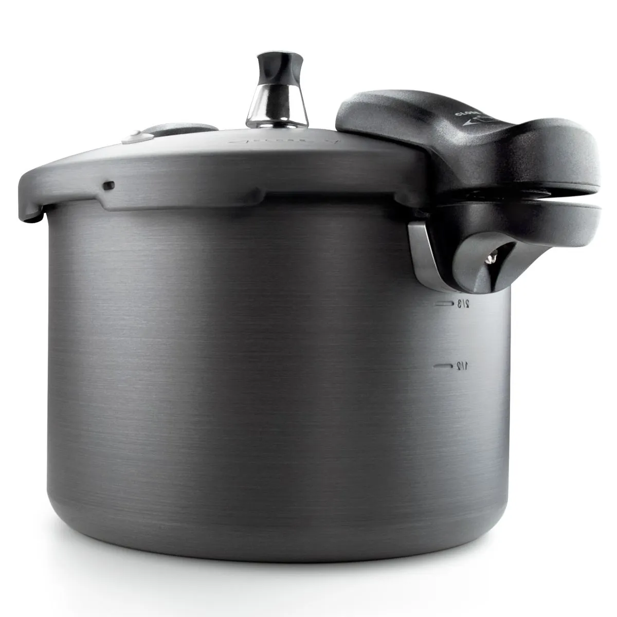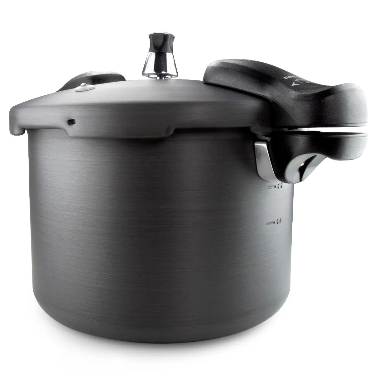 The Halulite 5.7 L Pressure Cooker from GSI is constructed of non-reactive, hard-anodized aluminum. The Halulite Pressure Cooker is lighter in weight and more efficient than most traditional camping pressure cookers. Loaded with safety features, you can safely and efficiently cook in the backcountry, under pressure.