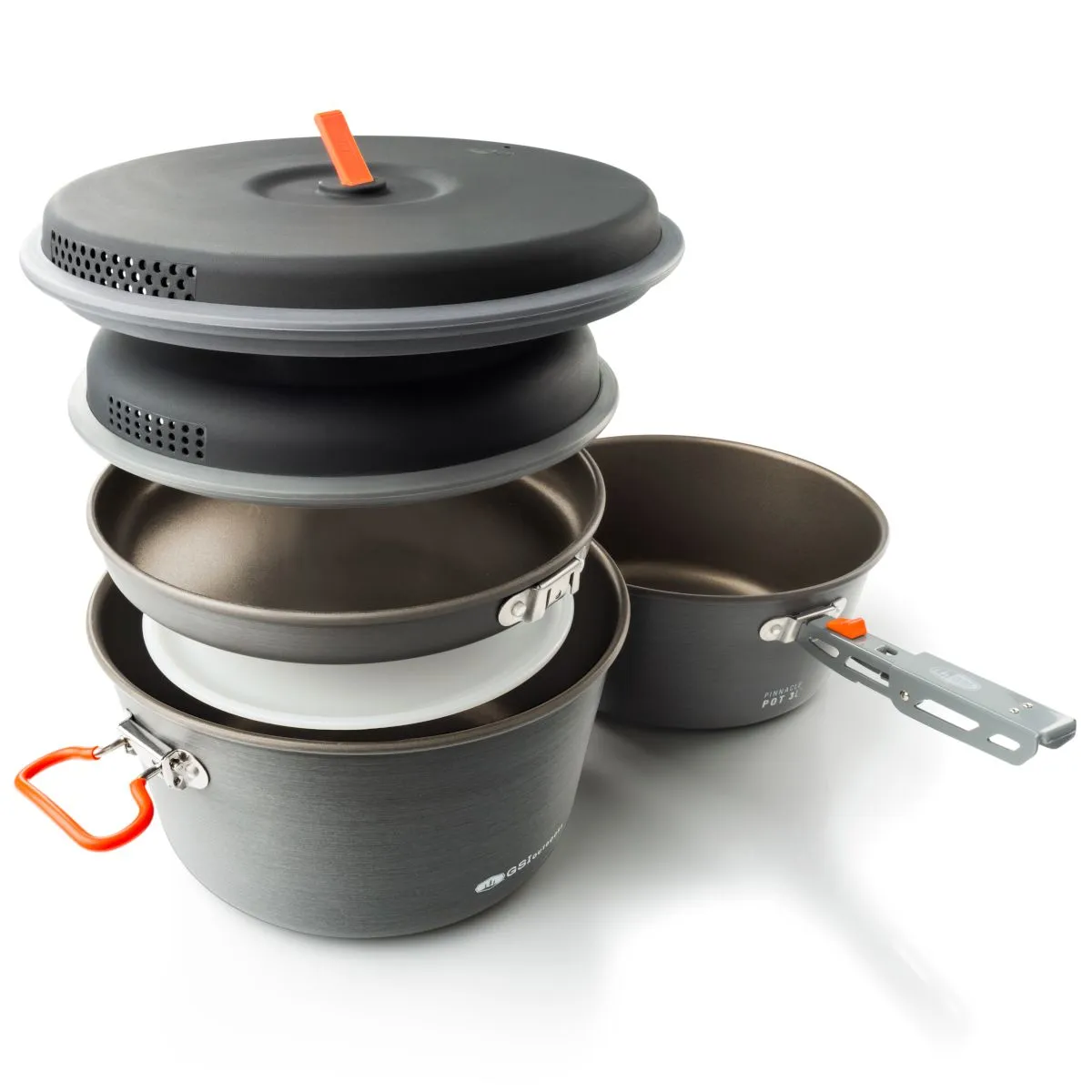 Locking, double bail handles make for easy handling of 5 L pot and secure enitre set for transport.
