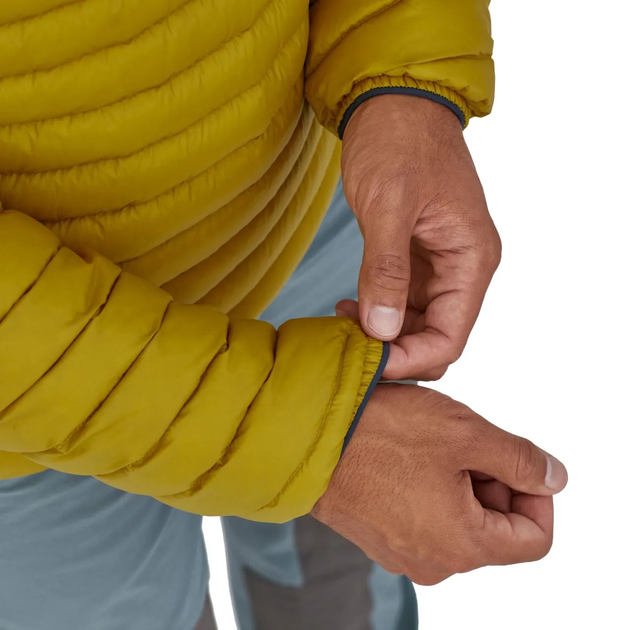 Varied quilting stabilizes goose down; overstuffed collar retains warmth; narrow channels provide shape and reduce bulk for enhanced mobility at elbows and shoulders; maintains loft and reduces drafts