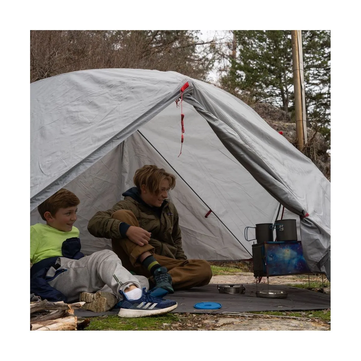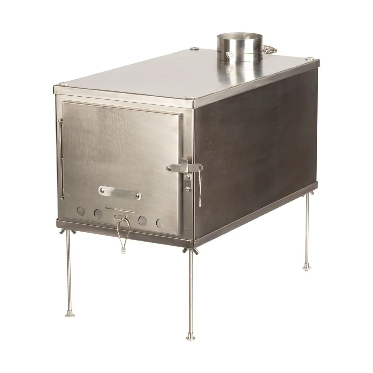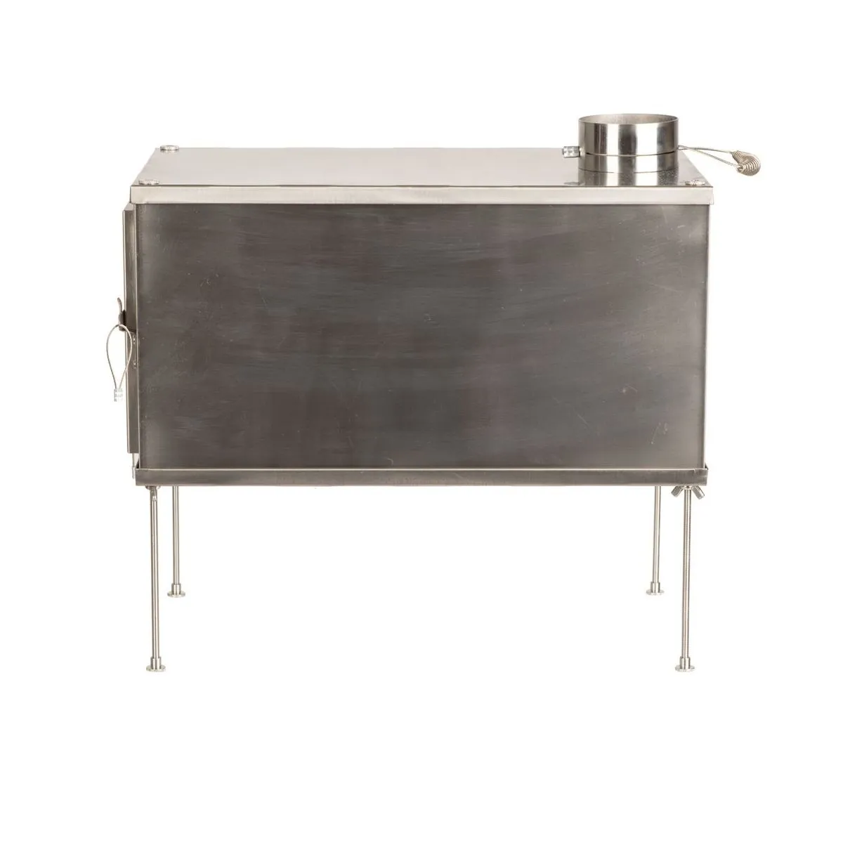 Ultralight titanium wood burning stove. Ready to use. Included in the bag: stove, 4 legs, 10′ chimney, spark arrestor, baffle, and fire poker. Chimney can be cut down to fit your tent as needed.