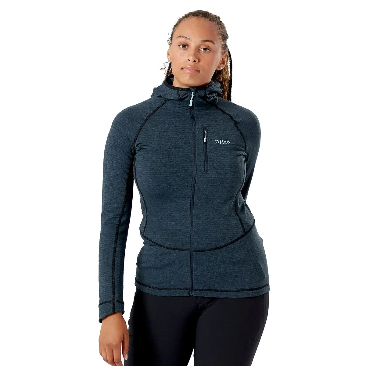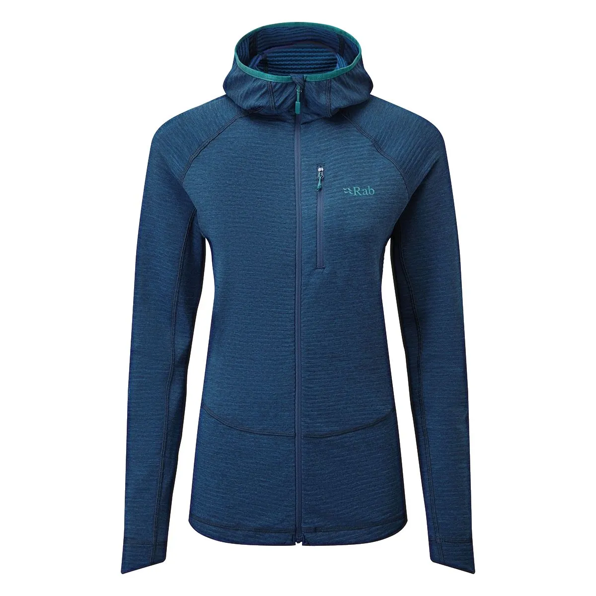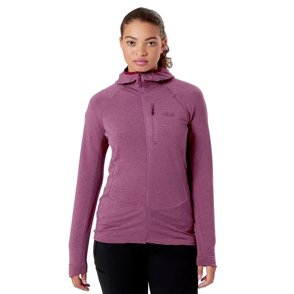 The Filament Hoody is built for high-output pursuits in cold winter conditions. It uses a lightweight, fast-wicking Thermicâ„¢ recycled fleece with a 7% elastane content for plenty of stretch on difficult ascents. As part of Rab’s highly technical Ascent range, it also features an athletic, low-bulk cut, as well as smooth flatlock seams for the easiest possible layering. Despite a weight of just 225g, the stripe-patterned fabric is extremely warm and durable, providing plenty of insulation, while helping transfer sweat between layers and away from the body. Additional mountain-ready features include a full-length YKK® front zip, a zipped chest pocket, an under-helmet hood and a set of unobtrusive thumb loops to keep your hands warm and your sleeves in place.