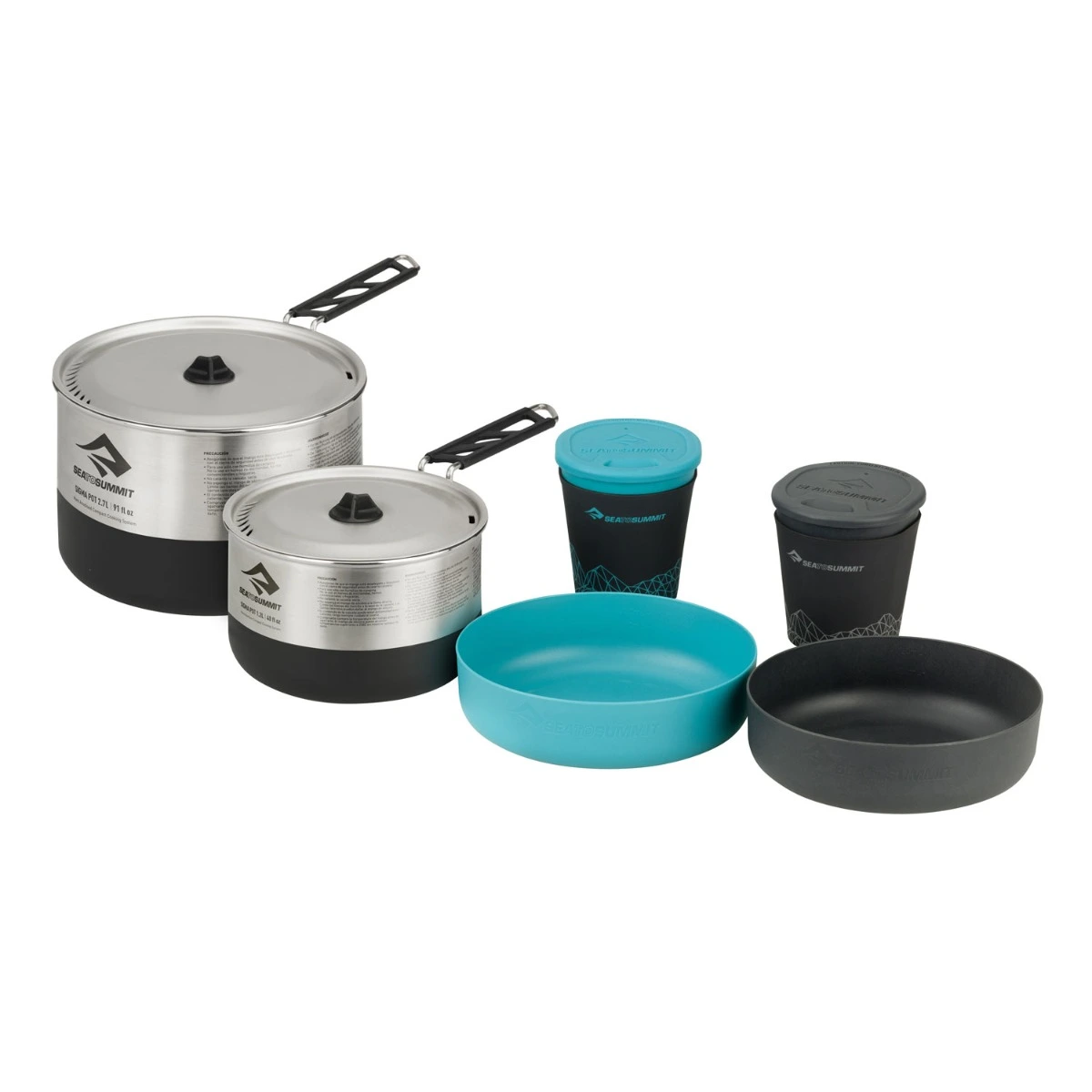 The 1.2L and 2.7L Sigma™ Pots of the 2.2 Cook Set are made of durable, abrasion resistant polished stainless steel for an easy-to-clean cooking surface. The Pivot-Lock™ handles lock firmly in place, the unique slotted pattern in the lid strains perfectly and the silicone Lid-Keep™ lets you rest the lid on the side of the pot.