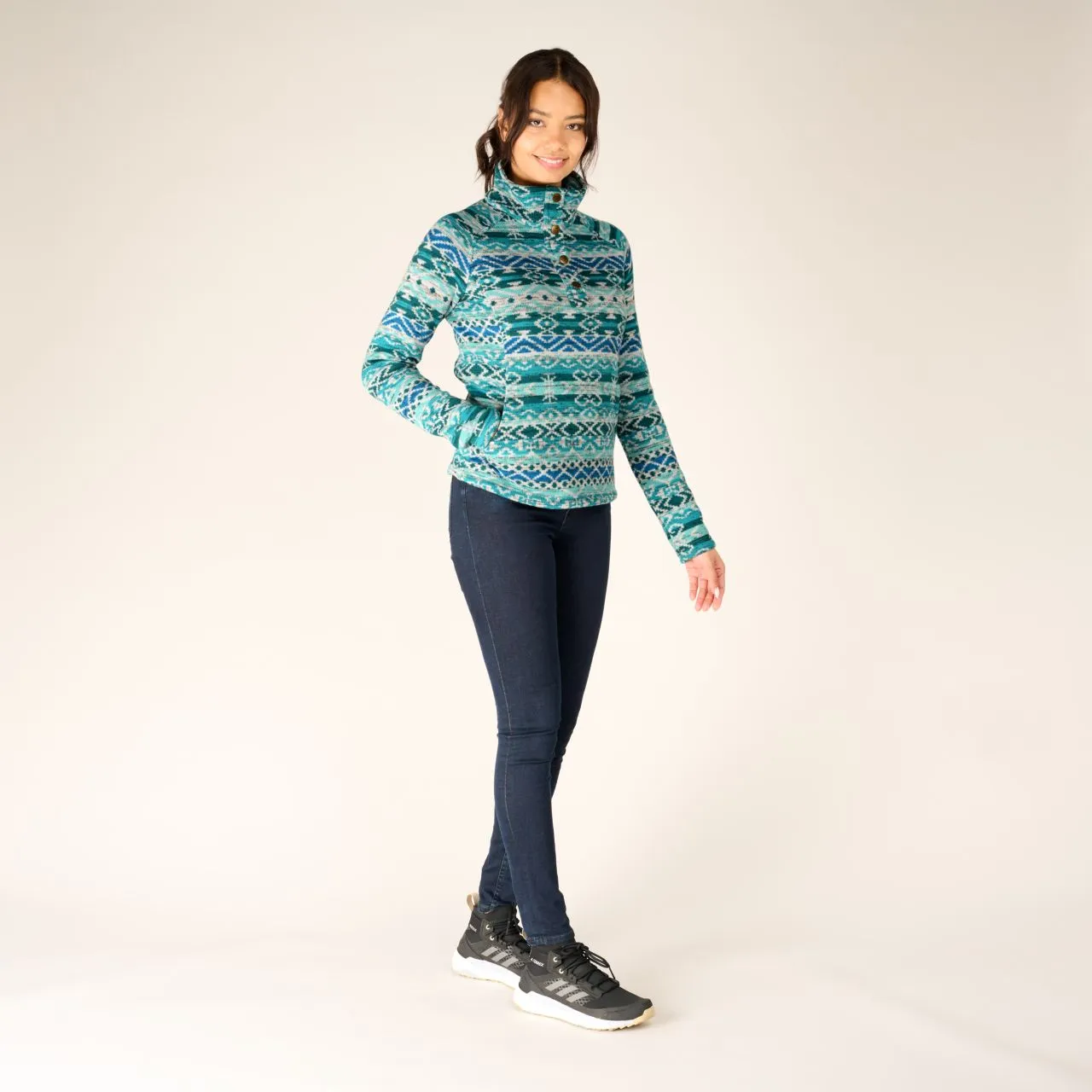 Beautifully designed with a Nepalese-inspired pattern, the Bhutan Pullover provides exceptional bulk-free warmth and a stylish, unique look. The raglan sleeves and forward-set shoulder seams enhance mobility while a kangaroo pocket provides additional warmth during colder adventures. Exceptionally comfortable, sustainable, and versatile, it’s finished with a snap front placket for easy ventilation.