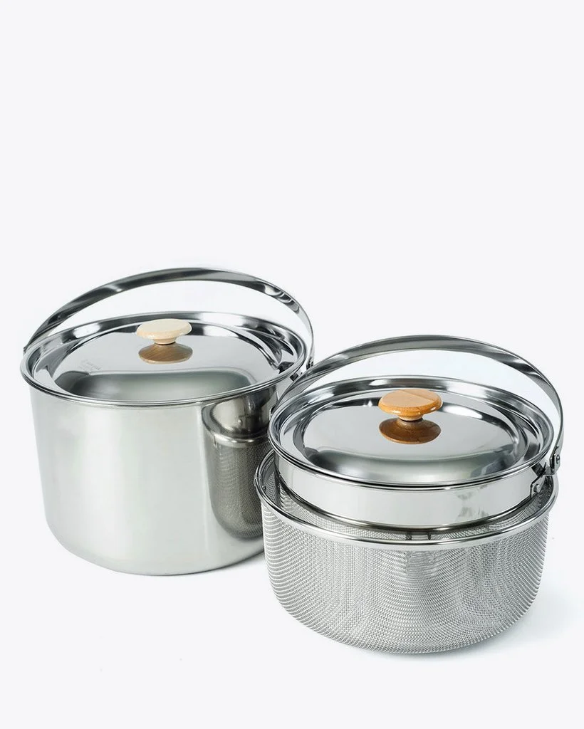 The durable Al dente Cookset is made up of two pots with lids and a mesh strainer. This set stacks neatly together and can be used over charcoal and wood fires for superb cooking.