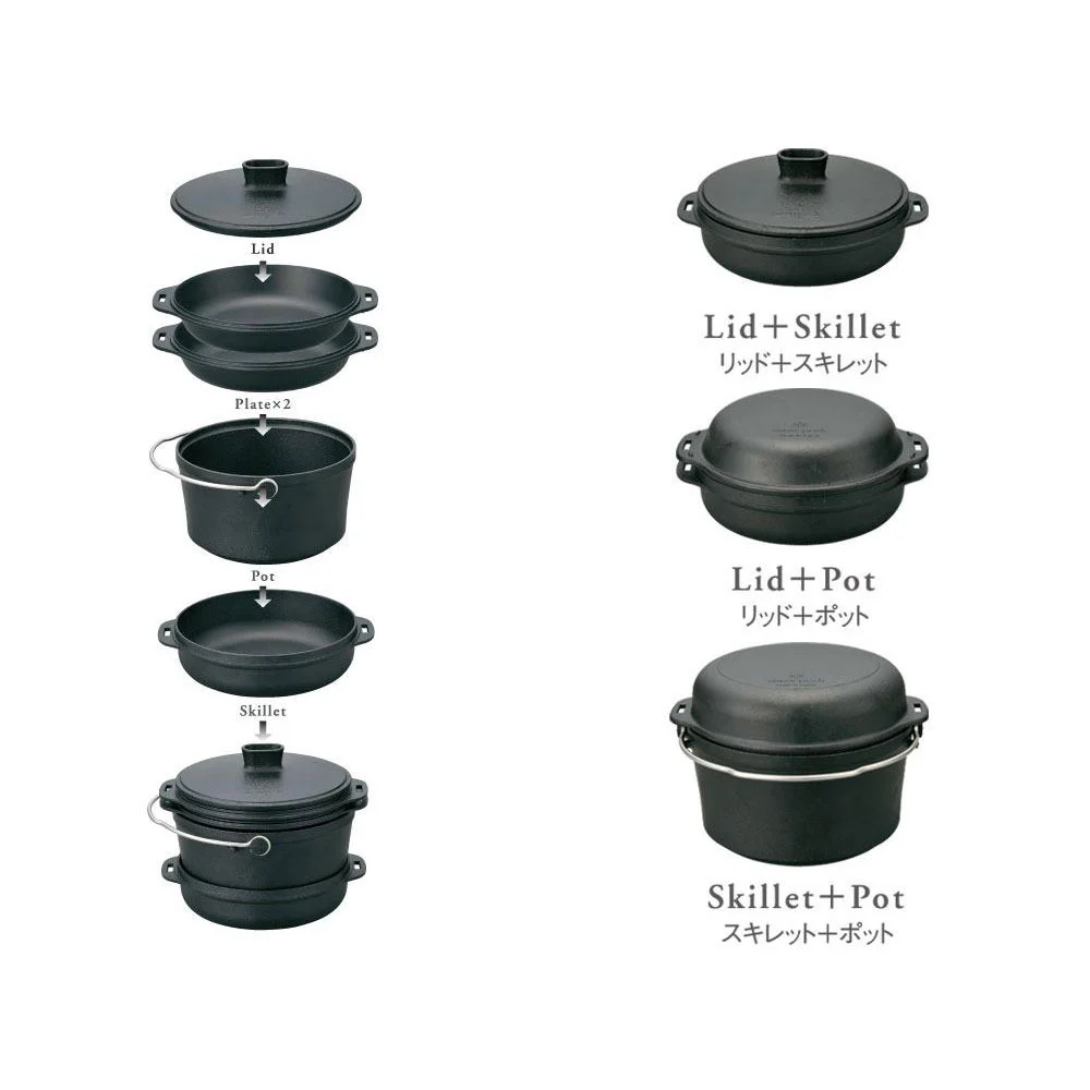 The Snow Peak Cast Iron Duo Cooker is a versatile, all-in-one, stackable cast iron cookset. Made with thin casting technology for savings in both weight and cook time. This premium-quality set includes a pot, a skillet, and two plates for a variety of cooking options.