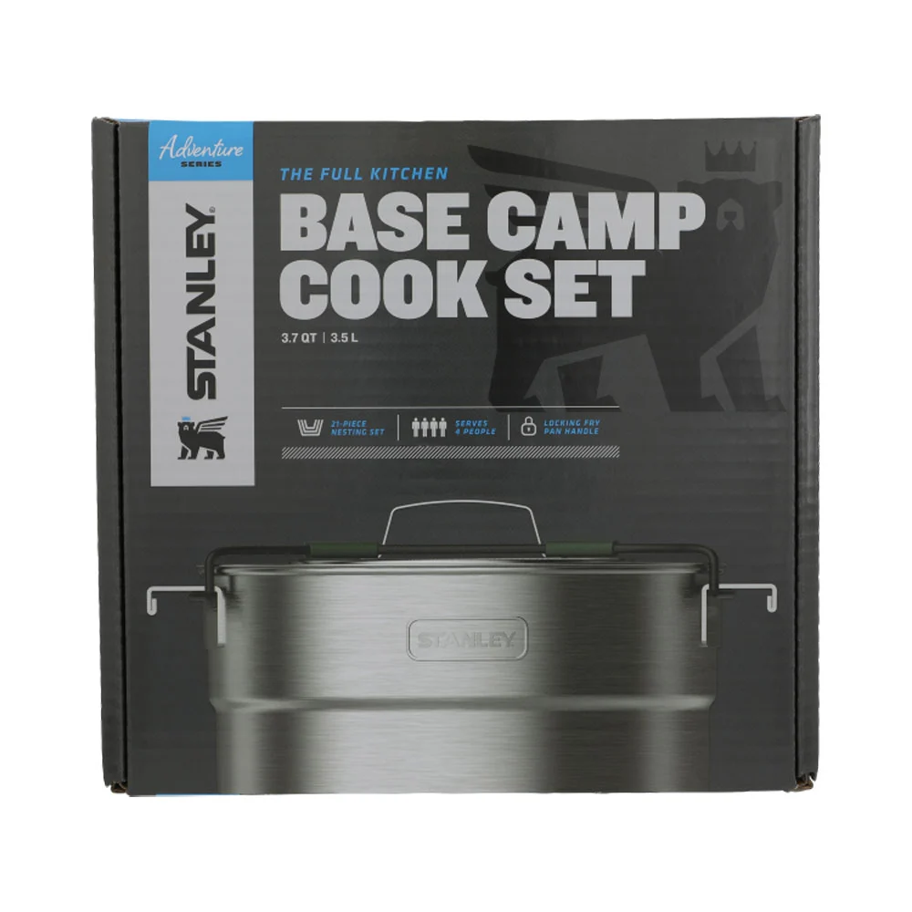• Set includes: [1] 3.7Qt / 3.5L pot, [1] vented lid, [1] 7.25in / 18.4cm diameter 3ply frying pan holds 32oz / 946mL, [1] cutting board, [1] spatula with extending handle, [1] serving spoon with extending handle, [4] 6in / 15.2cm diameter plates, [4] 22oz / 650mL bowls, [4] sporks, [1] dish drying rack, [1] heat resistant trivet, [1] locking bungee