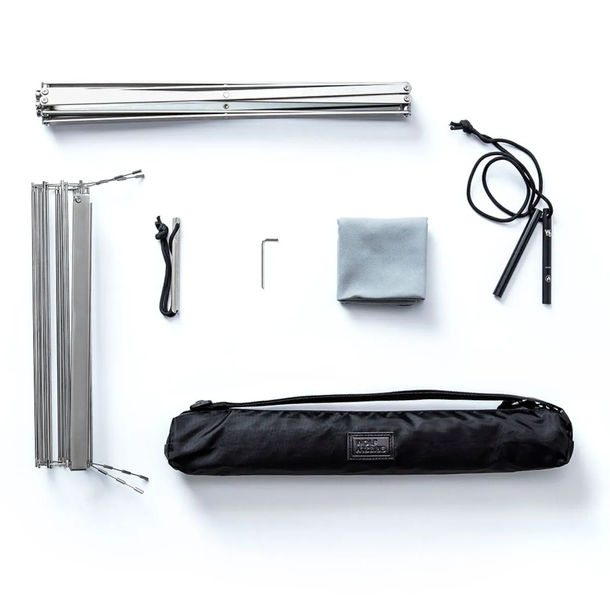 Includes: Rollable grill surface, foldable grill frame, premium carrying case, Fire Set steel striker, custom cleaning tool, microfiber cloth, compact allen key.